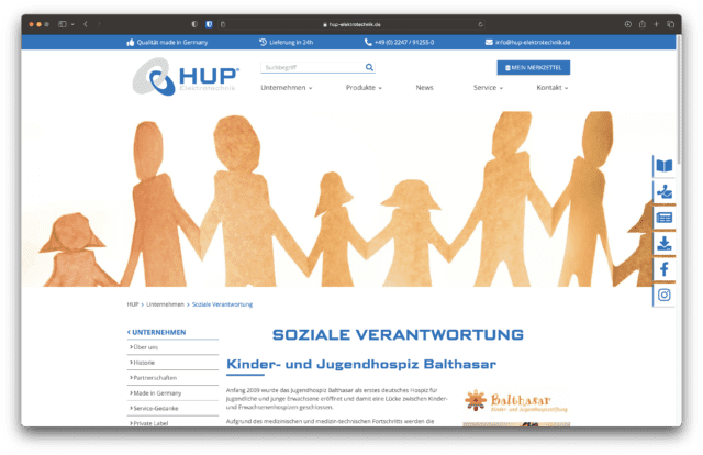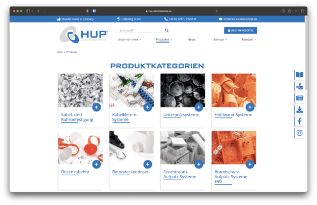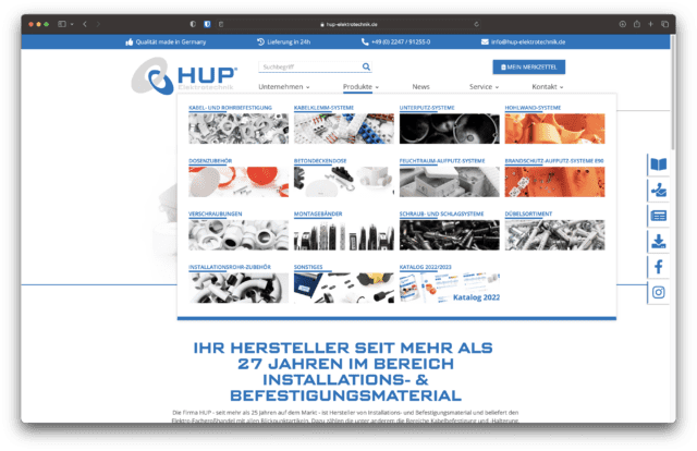 Die neue Website von HUP wurde 2020 gelauncht und wurde mit dem CMS-System Contao von uns umgesetzt. Auch die Vorgänger-Seite war bereits ein Contao-System. Die alte Website wurde also auf unser Dev-System kopiert und dort geupdated und gestalterisch überarbeitet. Diese Arbeitsweise bot sich an, da auch die Mitarbeiter des Kunden in den Prozess eingebunden waren und uns z. B. bei der Produktpflege zugearbeitet haben. Die neue Website bildet die Produkte noch besser ab und erleichtert die Produktsuche, welche um einen Merkzettel mit Anfragemöglichkeit erweitert wurde.