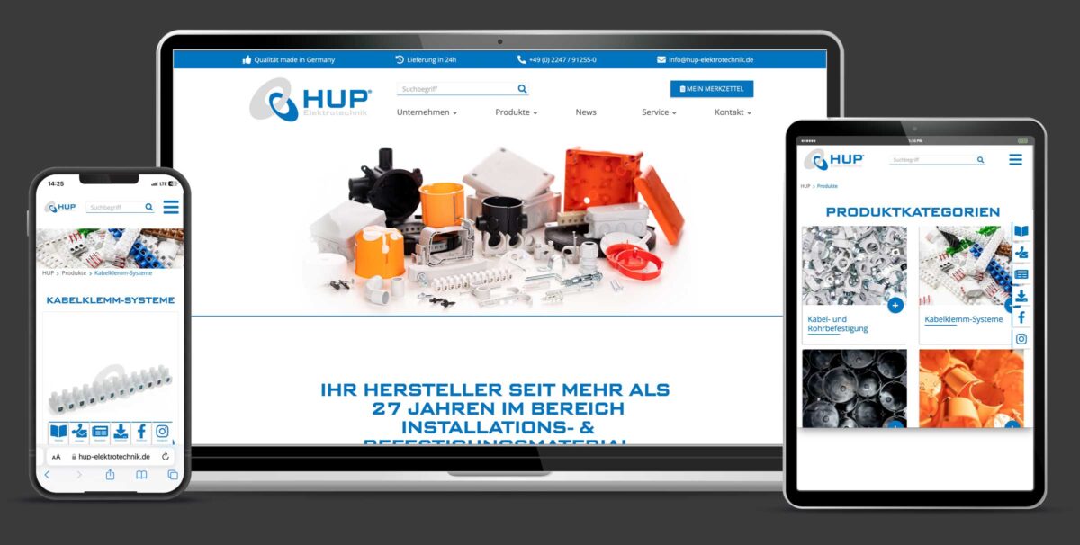 Die neue Website von HUP wurde 2020 gelauncht und wurde mit dem CMS-System Contao von uns umgesetzt. Auch die Vorgänger-Seite war bereits ein Contao-System. Die alte Website wurde also auf unser Dev-System kopiert und dort geupdated und gestalterisch überarbeitet. Diese Arbeitsweise bot sich an, da auch die Mitarbeiter des Kunden in den Prozess eingebunden waren und uns z. B. bei der Produktpflege zugearbeitet haben. Die neue Website bildet die Produkte noch besser ab und erleichtert die Produktsuche, welche um einen Merkzettel mit Anfragemöglichkeit erweitert wurde.